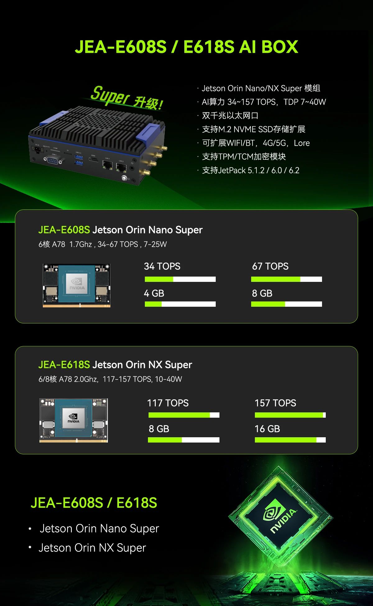 基于NVIDIA Jetson Orin Nano系列模组设计,提供最高 67 TOPS AI算力,支持最新的NVIDIA JetPack SDK和全面的AI软件堆栈,赋能全行业边缘智能应用。